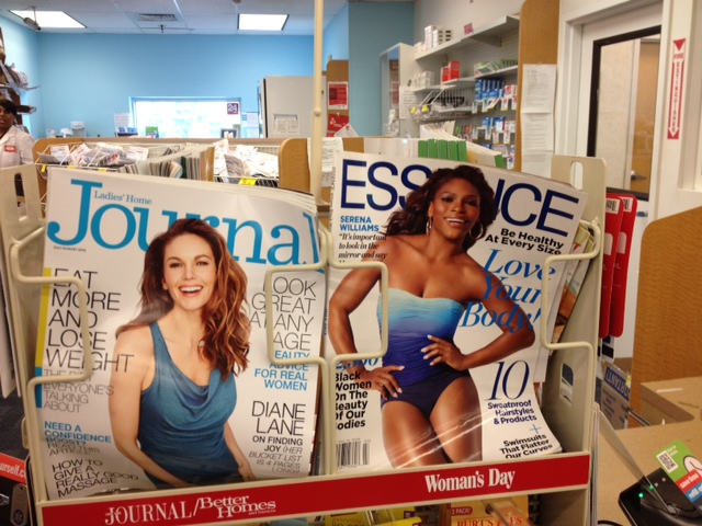 I love buying magazines like Essence, because it’s so different from traditional magazines that are marketed to women. Thinking about Cosmopolitan, People, Women’s Day, Redbook, Vogue etc., there is something radical about putting the words “love your body” on the front of a magazine without a diet tip section next to it. Especially when the magazine next to it has a skinny white lady with “Look Great at Any Age” and “Eat More and Lose Weight.”